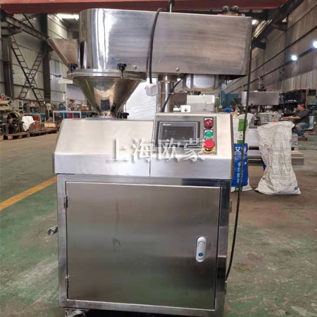 本機有送料機構、壓片機構、液壓機構、機架和電氣控制等部件組成,送料,壓片、制粒均采用變頻無級調速,油泵壓力可調,成品細度可以通過更換不同的篩網獲得。改進制粒轉籠,增加了顆粒的成品率。本機裝拆、清洗方便,與物料接觸部分皆為不銹鋼制作。產品符合GMP要求。物料由頂部送料漏斗加入,經兩壓輪強制擠壓成片狀后進入下部制粒室,在制粒室中片狀物料被制粒刀片打碎,然后進入整粒室,直至顆粒小于或等于網孔徑,顆粒通過網篩到盛料托盤。所需要顆粒大小可以通過調整篩網大小來決定。